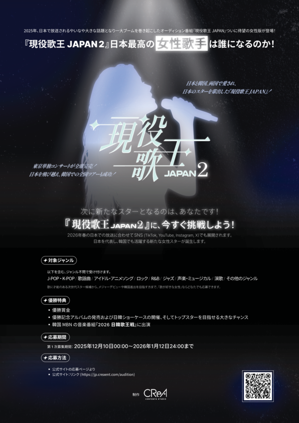 女性歌手オーディション番組「現役歌王 JAPAN2」参加者 予選オーディション年齢不問 女性 2026年1月12日 送信完了