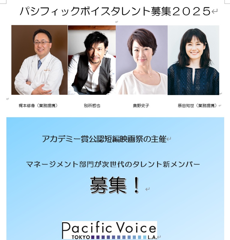 別所哲也・佐藤夕美子・奥野史子・原田知世(業務提携)・梶本修身(業務提携)など、俳優や女優、コメンテーターといった様々なジャンルで活躍する所属者がいる芸能プロダクションの「パシフィックボイス」では、アーティスト・タレント募集として、次なるスターを発掘するオーディションを開催している。★応募資格★