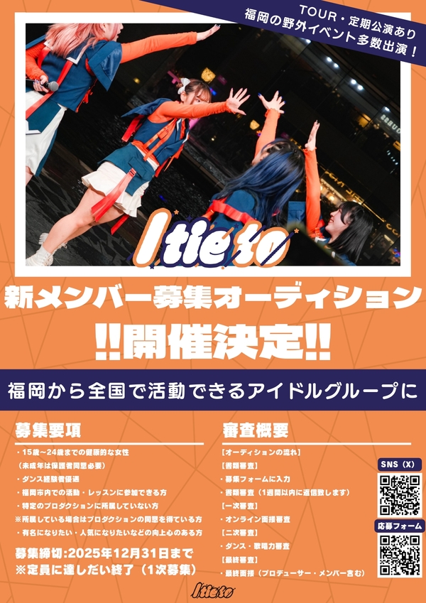 福岡から全国で活躍できるアイドルグループに!Itieto(アイタイト)新メンバー募集オーディションを開催している。元気で何事にも挑戦的な人、ダンス・ボーカル力に自信のある人を求めている(主催者談)、★応募資格★