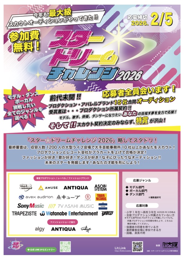 大手プロダクション&アパレルブランド総勢10社以上が参加する合同オーディションを開催している。★応募資格★
