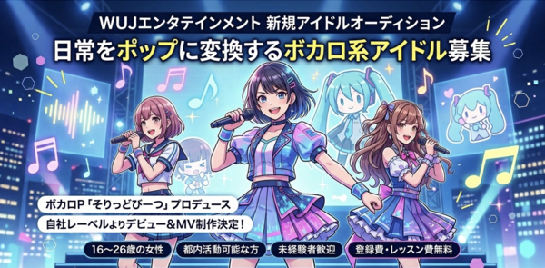 WUJエンタテインメント合同会社では、ボカロ作曲家「そりっとびーつ」によるオリジナル楽曲で活動し、自社レーベルからの音楽配信デビューを目指す新規アイドルメンバーを募集している。ボカロの世界観をリアルで表現しながら、楽曲制作・ライブ・配信リリースまで 一貫して行う育成型企画となっている。★応募資格★