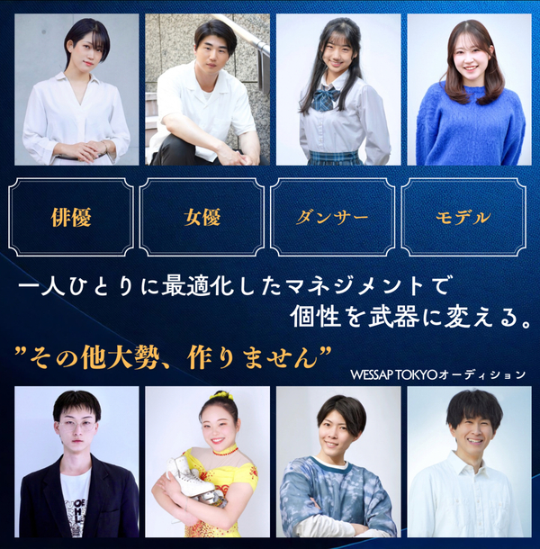 WESSAP TOKYOでは、役者・ダンサーなど本気で上を目指したい方を募集しています。私たちは、全員に同じ指導を行う育成ではなく、一人ひとりの個性・適性・目標に合わせて、育成内容・成長プラン・売り出し方を個別に設計しています。量産型の育成では埋もれてしまう時代だからこそ、その人にしかない強みを見つけ、伸ばし、武器に変えていく。それがWESSAP TOKYOの育成方針です(主催者談)。★応募資格★